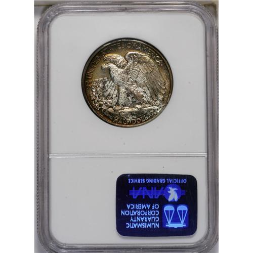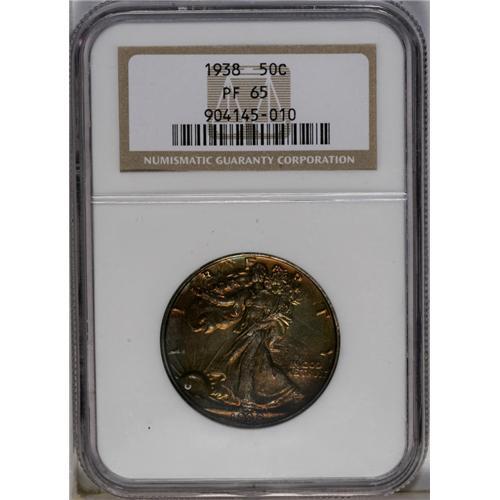 <B>1938<50C> PR65 NGC.</B></I> An early Gem among proof Walkers, this specimen's obverse has toned bronze with accents of magenta, while the reverse retains some original color in the center.