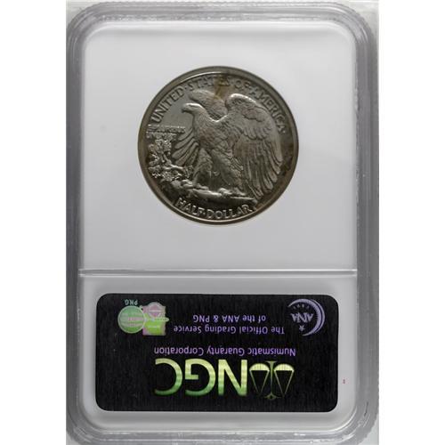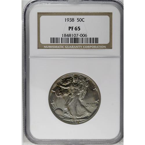 <B>1938<50C> PR65 NGC.</B></I> Fully struck with glassy fields and deep lilac-gray color over each side, augmented only slightly by reddish-brown toning streaks that originate near the borders. A dazzling Gem example of this scarcer early proof.