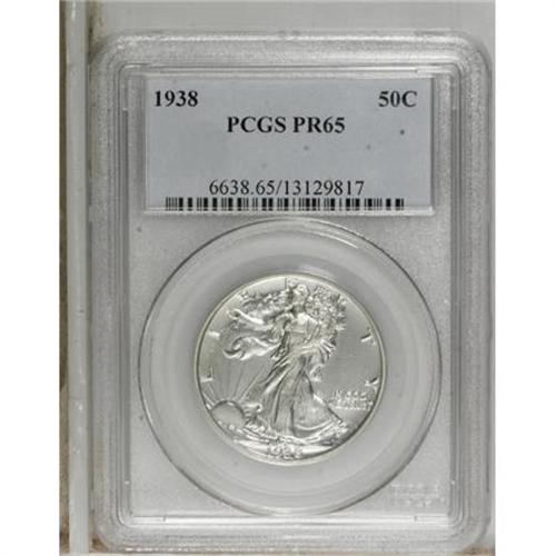 <B>1938 50C PR65 PCGS.</B></I> PCGS Population (708/670). NGC Census: (385/803). Mintage: 8,152. Numismedia Wsl. Price for NGC/PCGS coin in PR65: $875. (#6638)<BR><BR><b>Shipping:</b> Coins & Currency (<a target="_blank" href="http://www.heritageauctions.com/common/shipping.php">view shipping information</a>)