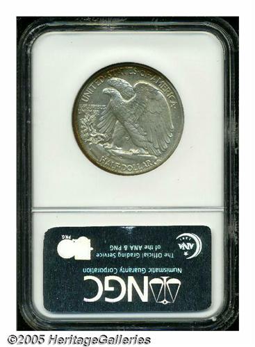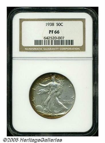 <B>1938<50C> PR66 NGC.</B></I> Bright proof surfaces display deep reddish-gold, lime-green, and lavender patina along portions of the borders. Exquisitely struck, with no significant marks to report.