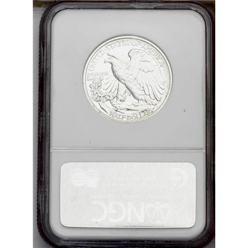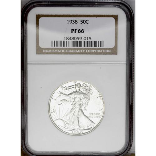 <B>1938<50C> PR66 NGC.</B></I> We have a date run from one consignor who has selected proof Walkers on the basis of how much frost can be found on the devices without actually calling the coin a Cameo. This high grade example has deeply reflective fields with a slight overlay of frost on the devices. Just the slightest toning is evident on each side.<BR><I>From The Lewis (Tahoe) Collection.</B></I>