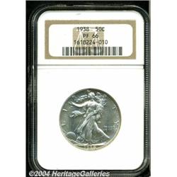 <B>1938<50C> PR66 NGC.</B></I> A premium quality proof Walker, with light color that deepens somewhat toward the rims, and highly reflective fields with deep mirrors. <BR><BR><B>Important notice:</B> Heritage usually auctions material at the rate of 200-250 lots per hour. On some occasions eBay Live bid software or the Internet may not be able to keep up with the pace of the auction. We recommend placing a realistic absentee bid now as insurance to avoid disappointment. Occasionally the auctioneer may eliminate or reject an eBay Live bid, and the auctioneer may also reopen a lot after the close of the eBay live bidding (usually because we missed an audience bid), and may reject your bid even if it shows you as the winning bidder. By bidding via eBay Live, you agree that Heritage may award the lot to another bidder at its sole discretion under the circumstances described above or any other reasonable circumstances. Since eBay bids are not shown to us until we open the lot on the floor, we treat those bids just like floor bids. In most cases the floor responds before the eBay bid is presented to us, due to Internet lag time, so for consistency we have made it a policy that floor bids are always considered first over tie eBay live bids. Also please note that all Heritage lots purchased through eBay Live carry a 20% Buyer's Premium. Please make sure you read the Terms and Conditions before you bid. </span></font></tr></table></td></tr></table>