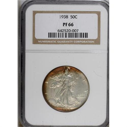 <B>1938 50C PR66 NGC.</B></I> NGC Census: (525/287). PCGS Population (478/196). Mintage: 8,152. Numismedia Wsl. Price for NGC/PCGS coin in PR66: $1,040. (#6638)<BR><BR><B>Coin Engraver:</B> Adolph A. Weinman<BR><BR><b>Shipping:</b> Coins & Currency (<a target="_blank" href="http://www.heritageauctions.com/common/shipping.php">view shipping information</a>)