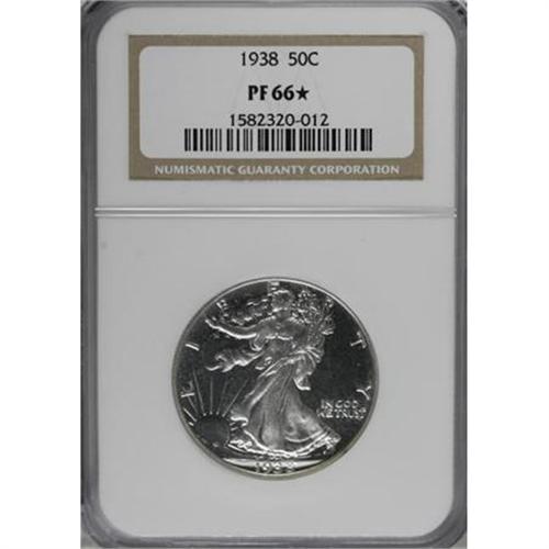 <B>1938 50C PR66 </B></I><img src="/images/star.gif" width="10" height="10" alt="" border="0"><B> NGC.</B></I> A boldly impressed and uncommonly appealing exemplar, strongly reflective with just a touch of silver-gray patina over the fields and on the eagle. One of just 8,152 specimens struck.<BR><BR><B>Coin Engraver:</B> Adolph A. Weinman<BR><BR><b>Shipping:</b> Coins & Currency (<a target="_blank" href="http://www.heritageauctions.com/common/shipping.php">view shipping information</a>)