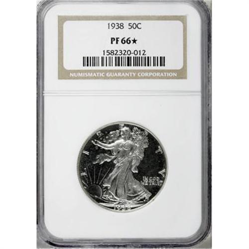 <B>1938 50C PR66 <img src="/images/star.gif" width="10" height="10" alt="" border="0"> NGC.</B></I> A boldly impressed and uncommonly appealing exemplar, strongly reflective with just a touch of silver-gray patina over the fields and on the eagle. One of just 8,152 specimens struck.<BR><BR><B>Coin Engraver:</B> Adolph A. Weinman<BR><BR><b>Shipping:</b> Coins & Currency (<a target="_blank" href="http://www.heritageauctions.com/common/shipping.php">view shipping information</a>)
