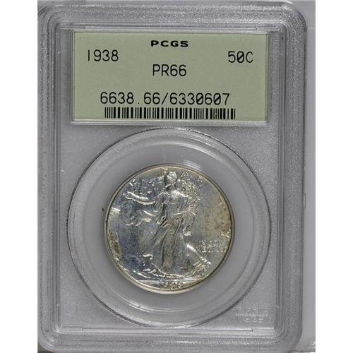 <B>1938<50C> PR66 PCGS.</B></I> Deeply mirrored with light haze over the fields and brown speckles at the periphery. An excellent example of this Depression-era brilliant proof. Housed in a yellow label holder.<BR><I>From The Carolina Gold Collection, Part Four.</B></I>