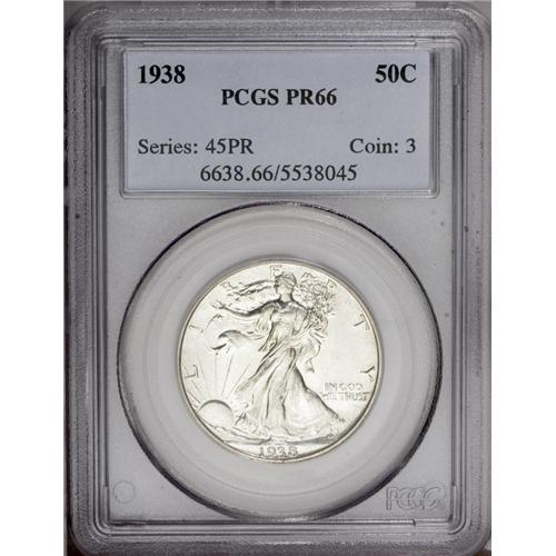 <B>1938<50C> PR66 PCGS.</B></I> Shimmering reflectivity in the fields with a slight accent of mint frost on the devices, each side shows evidence of light smoky-golden patina at the borders when precisely angled.