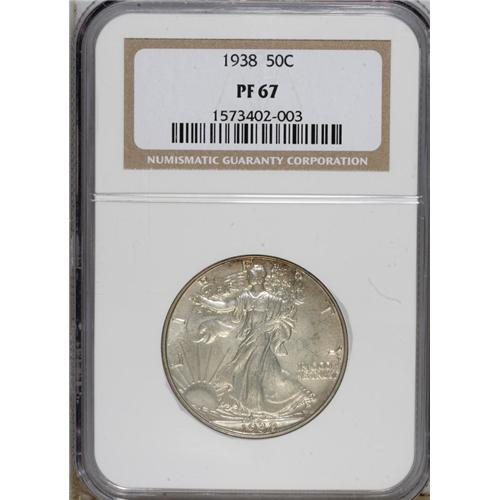 <B>1938 50C PR67 NGC.</B></I> A Superb proof with pale grayish-silver color. Both sides have exceptional full mirrors with proof surface also visible on the devices. Relatively few finer examples have been certified, including 41 better pieces graded by NGC (4/07).<BR><BR><b>Shipping:</b> Coins & Currency (<a target="_blank" href="http://www.heritageauctions.com/common/shipping.php">view shipping information</a>)
