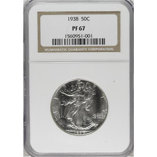 <B>1938 50C PR67 NGC.</B></I> Strongly impressed with powerful reflectivity and a near-absence of patina. An exceptionally clean example of this third Walking Liberty proof half issue, one of only 8,152 specimens struck.<BR><BR><b>Shipping:</b> Coins & Currency (<a target="_blank" href="http://www.heritageauctions.com/common/shipping.php">view shipping information</a>)
