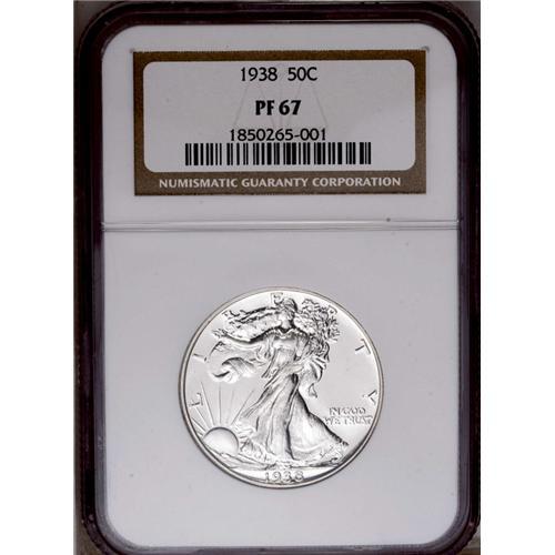<B>1938<50C> PR67 NGC.</B></I> This Superb Gem will undoubtedly please the connoisseur. Both sides have deeply mirrored fields and reflective devices. It is a sharply struck proof with brilliant silver color. The surfaces are virtually perfect.