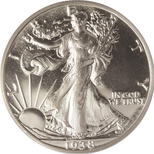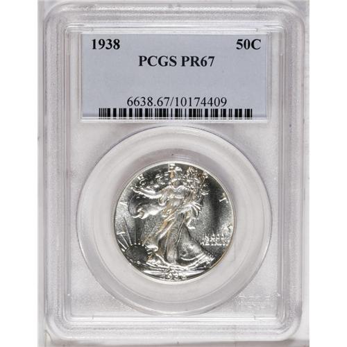 <B>1938<50C> PR67 PCGS.</B></I> Among the various issues of 20th century silver coins, the Walking Liberty half dollars are easily the most beautiful, and proof examples are the creme de la creme. This Superb Gem proof is remarkable for its stark beauty, with fully brilliant silver surfaces on each side. The fields are nicely mirrored with lustrous devices, especially on the obverse, providing excellent contrast. Proof coins from the middle 20th century with cameo contrast are rare and seldom encountered. PCGS has only certified 10 higher grade proof examples of this date (7/07).
