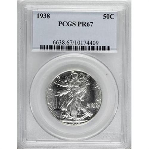 <B>1938 50C PR67 PCGS.</B></I> This Superb Gem proof has notable visual appeal with fully brilliant silver surfaces on each side. Strongly mirrored with a surprising degree of contrast, though not enough for a Cameo designation. PCGS has certified just 10 pieces finer (5/07).<BR><BR><b>Shipping:</b> Coins & Currency (<a target="_blank" href="http://www.heritageauctions.com/common/shipping.php">view shipping information</a>)