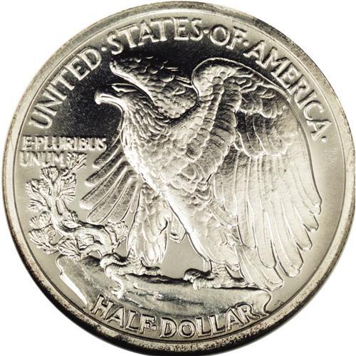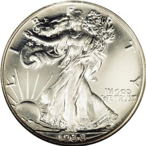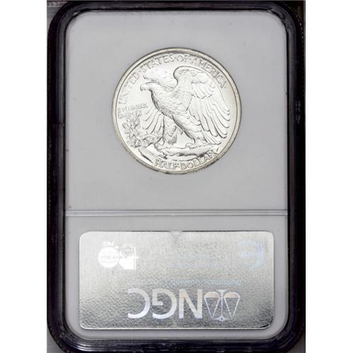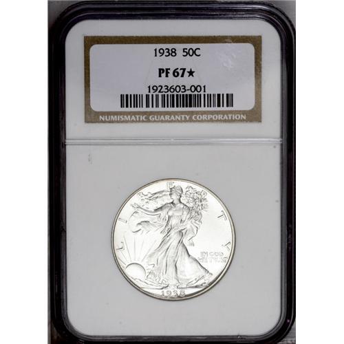 <B>1938<50C> PR67 <img border='0' src='http://www.heritagecoins.com/images/star.gif' width=10 height=10> NGC.</B></I> The Walking Liberty and the eagle display moderate cameo frost, and this feature doubtlessly inspired the Star designation from NGC. A brilliant and crisply struck Superb Gem. The AW monogram is a mere ghost, as made from a polished die. Struck from a slightly misaligned obverse die; the obverse rim is very thin near 7:30.