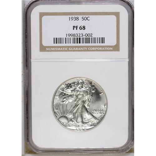 <B>1938 50C PR68 NGC.</B></I> A few thousand 1938 proof half dollars have been certified out of an 8,152-piece mintage, but fewer than 50 in the lofty grade of PR68, and none finer. This specimen displays outstanding brilliance. The strike has been well executed, though Liberty's left thumb is not fully defined. Close scrutiny reveals no significant marks. Census: 39 in 68, 0 finer (11/06).<BR><BR><b>Shipping:</b> Coin/Currency (<a target="_blank" href="http://www.heritageauctions.com/common/shipping.php">view shipping information</a>)