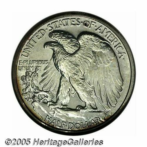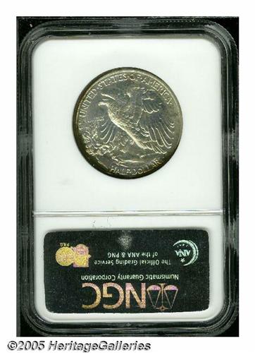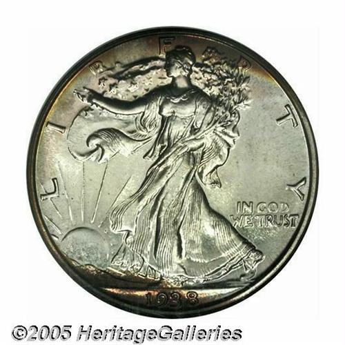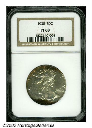 <B>1938<50C> PR68 NGC.</B></I> A stunning, Superb Gem with mostly brilliant silver surfaces. The obverse has two swaths of deep reddish gold toning, one at the top and the other at the bottom. The reverse has similar colored toning confined to the extreme border from 4 o'clock to 11 o'clock. Population: 31 in 68, 0 finer (1/05).