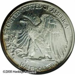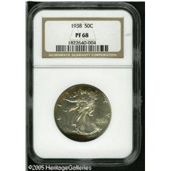 <B>1938 50C PR68 NGC.</B></I> This is tied for the finest Proof Half Dollar of the date certified by either PCGS or NGC. It is also a stunning Gem with mostly brilliant silver surfaces. The obverse has two swaths of deep reddish gold toning, one at the top and the other at the bottom. The reverse has similar colored toning confined to the extreme border from 4 o'clock to 11 o'clock. Population: 31 in 68, 0 finer (1/05). Lot:8229