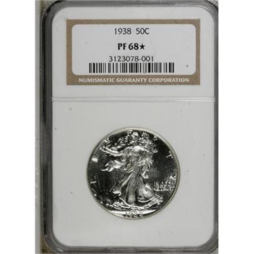 <B>1938 50C PR68 <img src="/images/star.gif" width="10" height="10" alt="" border="0"> NGC.</B></I> 1938 proof half dollars, with a mintage of more than 8,000 pieces, are relatively easy to acquire. Star-designated coins in the lofty grade of PR68, however, are another story. The current offering is such as coin. Its bright, untoned surfaces are immaculately preserved, and a powerful strike results in virtually complete delineation on the design elements. Census: 5 in 68 <B><img src="/images/star.gif" width="10" height="10" alt="" border="0"></B></I>, 0 finer with Star(1/08).<BR><BR><B>Coin Engraver:</B> Adolph A. Weinman<BR><BR><b>Shipping:</b> Coins & Currency (<a target="_blank" href="http://www.heritageauctions.com/common/shipping.php">view shipping information</a>)