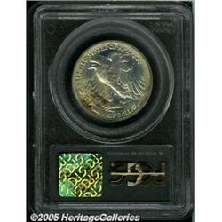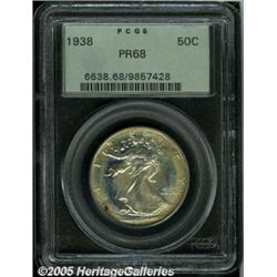 <B>1938 50C PR68 PCGS.</B></I> There is illimitable depth of reflectivity in the fields, which are veiled in lovely powder-blue and golden-tan iridescence that yields to brilliance in the centers. The razor sharp strike fully brings forth every element of this timeless design, and there is not a single distracting blemish on either side. A few swirls of more extensive toning have gathered over portions of the reverse. Population: 10 in 68, none finer at either service (2/05).