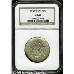 <B>1938 50C Texas MS67 NGC.</B></I> Lustrous surfaces are visited by deep maroon color around portions of the rims, framing light gray centers. Sharply struck, with no mentionable marks. NGC and PCGS combined have certified none finer. Population: 27 in 67, 0 finer (2/05).
