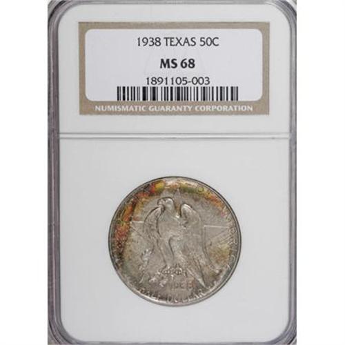 <B>1938 50C Texas MS67 to MS68 NGC.</B></I> All three Superb Gems feature delightful peripheral golden-brown, emerald-green, and rose-red toning. The set includes: <B>1938 MS68,</B></I> well struck devices and immaculate fields; <B>1938-D MS67 S,</B></I> a sharp strike, remarkably preserved; and a <B>1938-S MS68 S,</B></I> colorfully patinated and precisely struck, one of only three so graded by NGC (6/07).<BR><I>From The Cary & Cheryl Porter Collection, Part Three.</B></I><BR><BR><b>Shipping:</b> Coins & Currency (<a target="_blank" href="http://www.heritageauctions.com/common/shipping.php">view shipping information</a>\)
