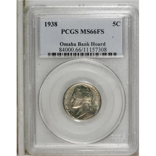 <B>1938 5C MS66 Full Steps PCGS.</B></I> Omaha Bank Hoard. PCGS Population (116/6). NGC Census: (10/3). (#84000)<BR><BR><b>Shipping:</b> Coins & Currency (<a target="_blank" href="http://www.heritageauctions.com/common/shipping.php">view shipping information</a>)