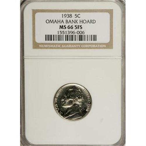 <B>1938 5C MS66 Full Steps NGC.</B></I> Ex: Omaha Bank Hoard. NGC Census: (10/3). PCGS Population (106/6). (#84000)<BR><BR><b>Shipping:</b> Coins & Currency (<a target="_blank" href="http://www.heritageauctions.com/common/shipping.php">view shipping information</a>)