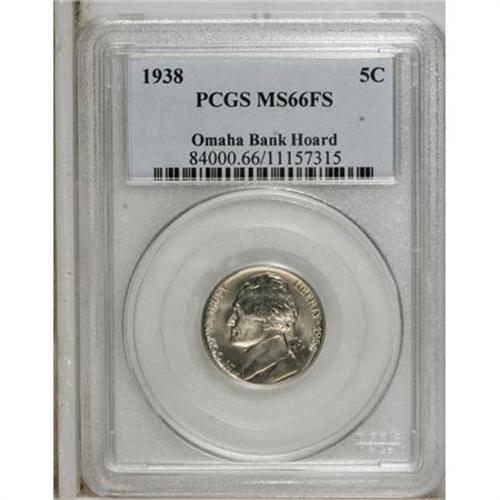 <B>1938 5C MS66 Full Steps PCGS.</B></I> Ex: Omaha Bank Hoard. PCGS Population (106/6). NGC Census: (10/3). (#84000)<BR><BR><b>Shipping:</b> Coins & Currency (<a target="_blank" href="http://www.heritageauctions.com/common/shipping.php">view shipping information</a>)
