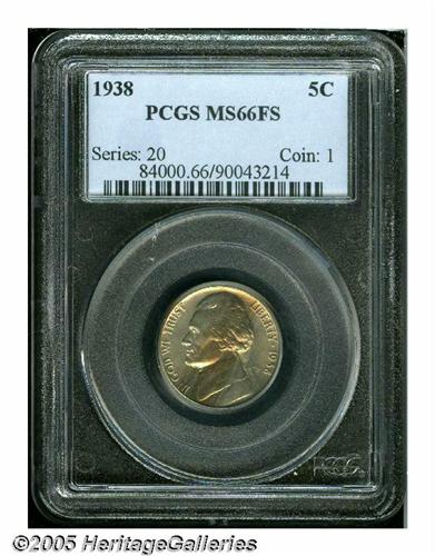 <B>1938<5C> MS66 Full Steps PCGS.</B></I> Well struck and expertly preserved, this beautiful premium Gem displays a swath of streaky terra cotta toning across the center of each side, flanked by typical gray-green coloration. The satiny surfaces have a faintly matte-like texture, and there are just a couple of tiny contact marks to be found on obverse and reverse alike. Population: 49 in 66 Full Steps, 3 finer (3/05).