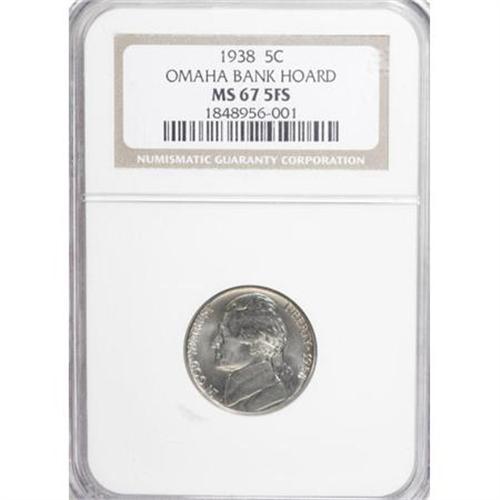 <B>1938 5C MS67 Full Steps NGC.</B></I> Ex: Omaha Bank Hoard. Crisply struck design elements and untoned surfaces are illuminated by a pleasing satiny sheen. Wispy die striations are noted in the fields, and a tiny nick in the lower right obverse field is seen only under magnification. Census: 3 in 67 Full Bands, 0 finer (5/07). <BR><BR><b>Shipping:</b> Coins & Currency (<a target="_blank" href="http://www.heritageauctions.com/common/shipping.php">view shipping information</a>)