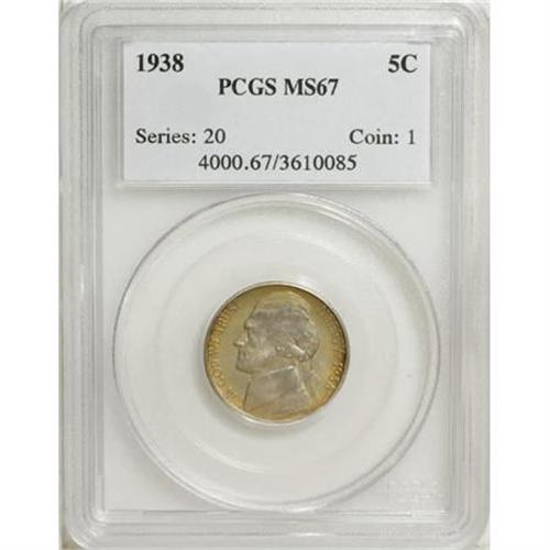 <B>1938 5C MS67 PCGS.</B></I> PCGS Population (19/0). NGC Census: (177/0). Mintage: 19,515,364. Numismedia Wsl. Price for NGC/PCGS coin in MS67: $70. (#4000)<BR><BR><B>Coin Engraver:</B> Felix Schlag<BR><BR><b>Shipping:</b> Coins & Currency (<a target="_blank" href="http://www.heritageauctions.com/common/shipping.php">view shipping information</a>\)