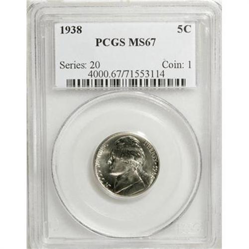 <B>1938 5C MS67 PCGS.</B></I> PCGS Population (19/0). NGC Census: (177/0). Mintage: 19,515,364. Numismedia Wsl. Price for NGC/PCGS coin in MS67: $80. (#4000)<BR><BR><B>Coin Engraver:</B> Felix Schlag<BR><BR><b>Shipping:</b> Coins & Currency (<a target="_blank" href="http://www.heritageauctions.com/common/shipping.php">view shipping information</a>)