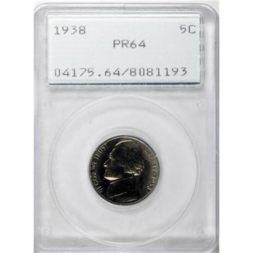 <B>1938 5C PR64 PCGS.</B></I> PCGS Population (402/1611). NGC Census: (123/783). Mintage: 19,365. Numismedia Wsl. Price for NGC/PCGS coin in PR64: $82. (#4175)<BR><BR><B>Coin Engraver:</B> Felix Schlag<BR><BR><b>Shipping:</b> Coins & Currency (<a target="_blank" href="http://www.heritageauctions.com/common/shipping.php">view shipping information</a>)