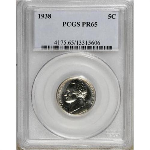 <B>1938 5C PR65 PCGS.</B></I> PCGS Population (674/925). NGC Census: (251/530). Mintage: 19,365. Numismedia Wsl. Price for NGC/PCGS coin in PR65: $104. (#4175)<BR><BR><B>Coin Engraver:</B> Felix Schlag<BR><BR><b>Shipping:</b> Coins & Currency (<a target="_blank" href="http://www.heritageauctions.com/common/shipping.php">view shipping information</a>)