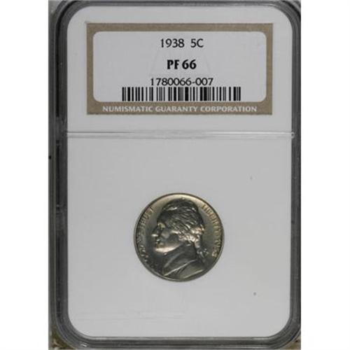 <B>1938 5C PR66 NGC.</B></I> . NGC Census: (374/157). PCGS Population (709/221). Mintage: 19,365. Numismedia Wsl. Price for NGC/PCGS coin in PR66: $130. (#4175)<BR><BR><B>Coin Engraver:</B> Felix Schlag<BR><BR><b>Shipping:</b> Coins & Currency (<a target="_blank" href="http://www.heritageauctions.com/common/shipping.php">view shipping information</a>)