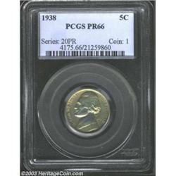 1938 5C PR66 PCGS. An attractive blend of pastel green, yellow, and crimson color is seen on each side of this nearly pristine proof Gem. Other than a minor graze on the upper reverse, and a handful of carbon spots sprinkled over both obverse and reverse, there are no imperfections to report. Important notice: We expect to be auctioning lots at the rate of 200-250 per hour. On occasion eBay live bid software cannot keep up with the pace of the auctions where 4-5 lots per minute can hammer down, so we recommend that you place a realistic absentee bid now as insurance to avoid disappointment. Also please note that all Heritage/CAA lots purchased through eBay Live carry a 20% Buyer's Premium. Please make sure you read the Terms and Conditions.