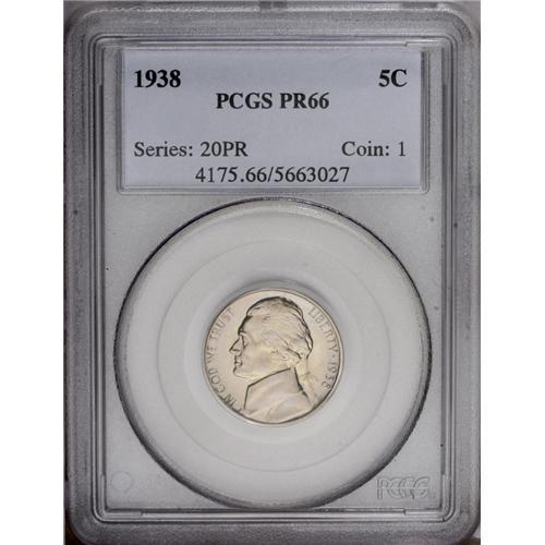 <B>1938<5C> PR66 PCGS.</B></I> Fully struck and impeccably preserved, with a light coating of haziness over each side that becomes a bit thicker near the borders.