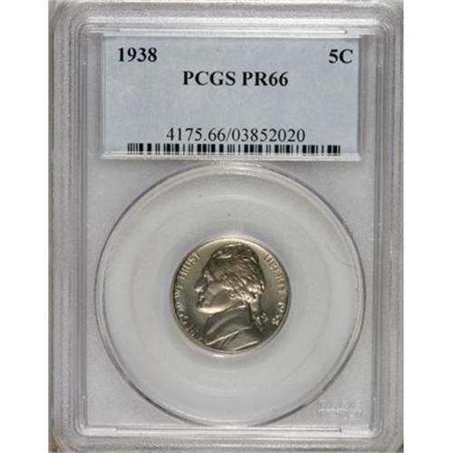 <B>1938 5C PR66 PCGS.</B></I> PCGS Population (668/210). NGC Census: (369/148). Mintage: 19,365. Numismedia Wsl. Price for NGC/PCGS coin in PR66: $135. (#4175)<BR><BR><b>Shipping:</b> Coins & Currency (<a target="_blank" href="http://www.heritageauctions.com/common/shipping.php">view shipping information</a>)