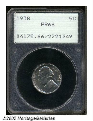 <B>1938<5C> PR66 PCGS.</B></I> This lightly toned Gem reveals well blended opaque-white and sky-blue iridescence over essentially problem-free surfaces. Housed in an early PCGS holder.