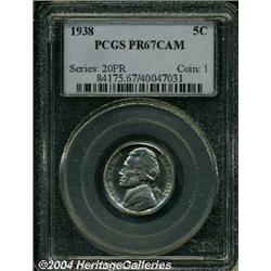 <B>1938<5C> PR67 Cameo PCGS.</B></I> Intensely reflective and untoned, a light cameo contrast is detected on each side. Worth a close look for the Jefferson Nickel collector. <BR><BR><B>Important notice:</B> Heritage usually auctions material at the rate of 200-250 lots per hour. On some occasions eBay Live bid software or the Internet may not be able to keep up with the pace of the auction. We recommend placing a realistic absentee bid now as insurance to avoid disappointment. Occasionally the auctioneer may eliminate or reject an eBay Live bid, and the auctioneer may also reopen a lot after the close of the eBay live bidding (usually because we missed an audience bid), and may reject your bid even if it shows you as the winning bidder. By bidding via eBay Live, you agree that Heritage may award the lot to another bidder at its sole discretion under the circumstances described above or any other reasonable circumstances. Since eBay bids are not shown to us until we open the lot on the floor, we treat those bids just like floor bids. In most cases the floor responds before the eBay bid is presented to us, due to Internet lag time, so for consistency we have made it a policy that floor bids are always considered first over tie eBay live bids. Also please note that all Heritage lots purchased through eBay Live carry a 20% Buyer's Premium. Please make sure you read the Terms and Conditions before you bid.