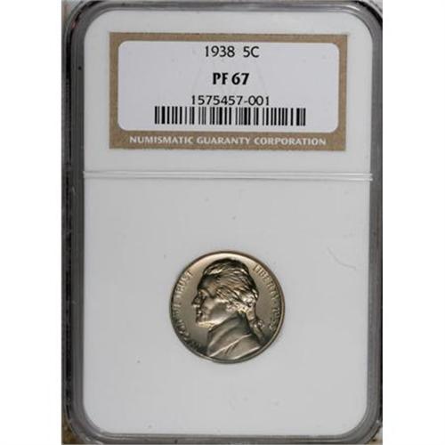 <B>1938 5C PR67 NGC.</B></I> NGC Census: (142/8). PCGS Population (206/11). Mintage: 19,365. Numismedia Wsl. Price for NGC/PCGS coin in PR67: $280. (#4175)<BR><BR><B>Coin Engraver:</B> Felix Schlag<BR><BR><b>Shipping:</b> Coins & Currency (<a target="_blank" href="http://www.heritageauctions.com/common/shipping.php">view shipping information</a>\)