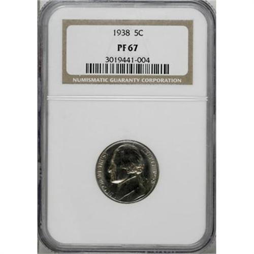 <B>1938 5C PR67 NGC.</B></I> NGC Census: (151/8). PCGS Population (211/11). Mintage: 19,365. Numismedia Wsl. Price for NGC/PCGS coin in PR67: $290. (#4175)<BR><BR><B>Coin Engraver:</B> Felix Schlag<BR><BR><b>Shipping:</b> Coins & Currency (<a target="_blank" href="http://www.heritageauctions.com/common/shipping.php">view shipping information</a>)