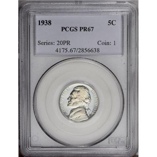 <B>1938<5C> PR67 PCGS.</B></I> Fully struck with glittering proof surfaces that have lovely purple-rose and ice-blue toning. Expertly preserved and free of contact marks or hairlines.