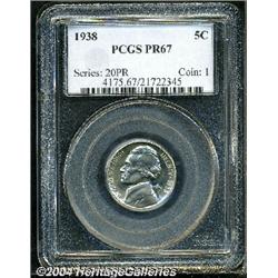 <B>1938<5C> PR67 PCGS.</B></I> Brilliant surfaces display a few faint touches of pale-violet coloration, and are virtually devoid of any serious impairments. <BR><BR><B>Important notice:</B> Heritage usually auctions material at the rate of 200-250 lots per hour. On some occasions eBay Live bid software or the Internet may not be able to keep up with the pace of the auction. We recommend placing a realistic absentee bid now as insurance to avoid disappointment. Occasionally the auctioneer may eliminate or reject an eBay Live bid, and the auctioneer may also reopen a lot after the close of the eBay live bidding (usually because we missed an audience bid), and may reject your bid even if it shows you as the winning bidder. By bidding via eBay Live, you agree that Heritage may award the lot to another bidder at its sole discretion under the circumstances described above or any other reasonable circumstances. Since eBay bids are not shown to us until we open the lot on the floor, we treat those bids just like floor bids. In most cases the floor responds before the eBay bid is presented to us, due to Internet lag time, so for consistency we have made it a policy that floor bids are always considered first over tie eBay live bids. Also please note that all Heritage lots purchased through eBay Live carry a 20% Buyer's Premium. Please make sure you read the Terms and Conditions before you bid.