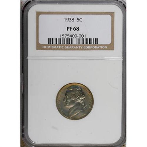 <B>1938 5C PR68 NGC.</B></I> Iridescent rainbow toning gravitates to the margins of this gorgeous proof. Razor-sharp definition and exquisite preservation characterizes both obverse and reverse. Census: 8 in 68, 0 finer (6/07).<BR><BR><b>Shipping:</b> Coins & Currency (<a target="_blank" href="http://www.heritageauctions.com/common/shipping.php">view shipping information</a>)