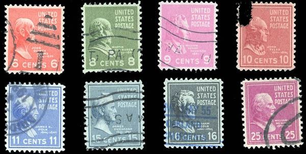 1938, 6¢ to 25¢ Presidential issue, a high grade used group of 8. Scott 811//829. Including 6¢ John Quincy Adams -this one has an SMQ value of $65 - all others are not listed), 8¢ Van Buren, 9¢ William Henry Harrison, 10¢ Tyler, 11¢ Polk, 15¢ Buchanan, 16¢ Lincoln (XF-S 95Q), and 25¢ McKinley, this is a great find for the used specialist, XF-SUP, each with 2024 P.F. certificate graded XF-SUP 95