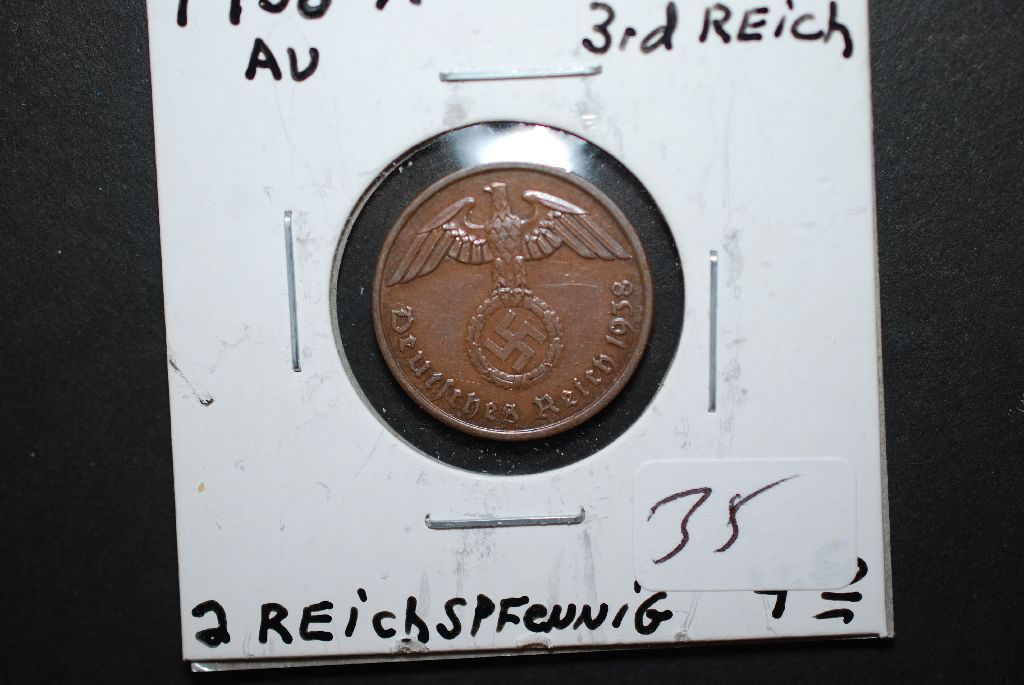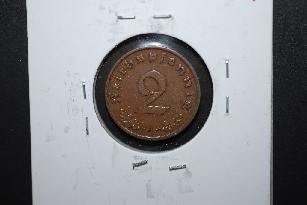 1938-A German 2 Reichspfennig Foreign Coin With Flying Eagle Holding Swatstika; AU; EST. $10-15