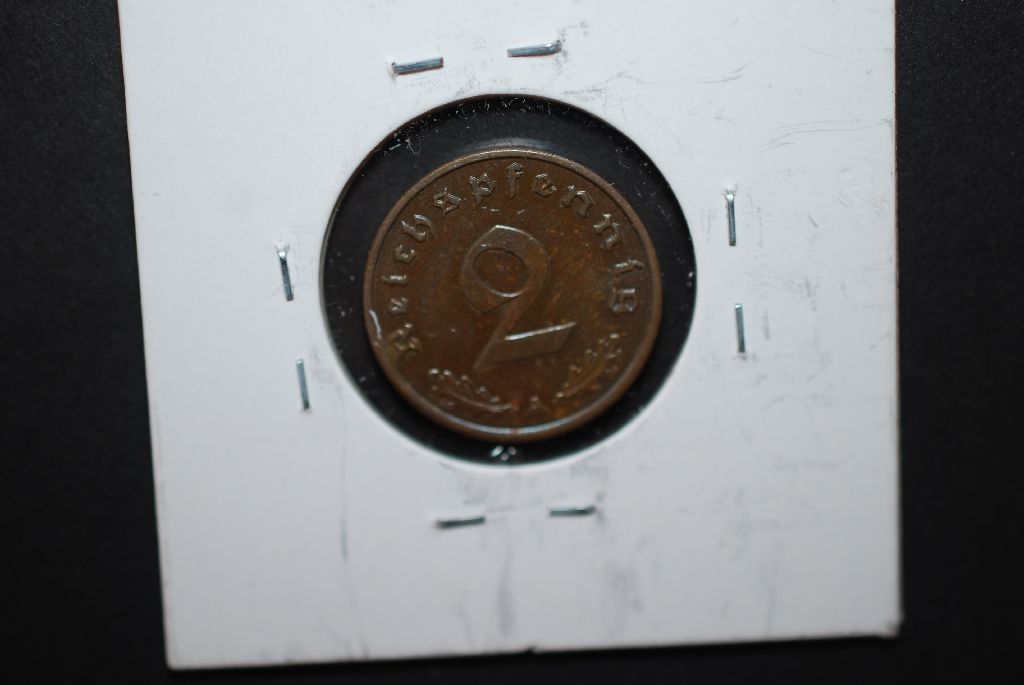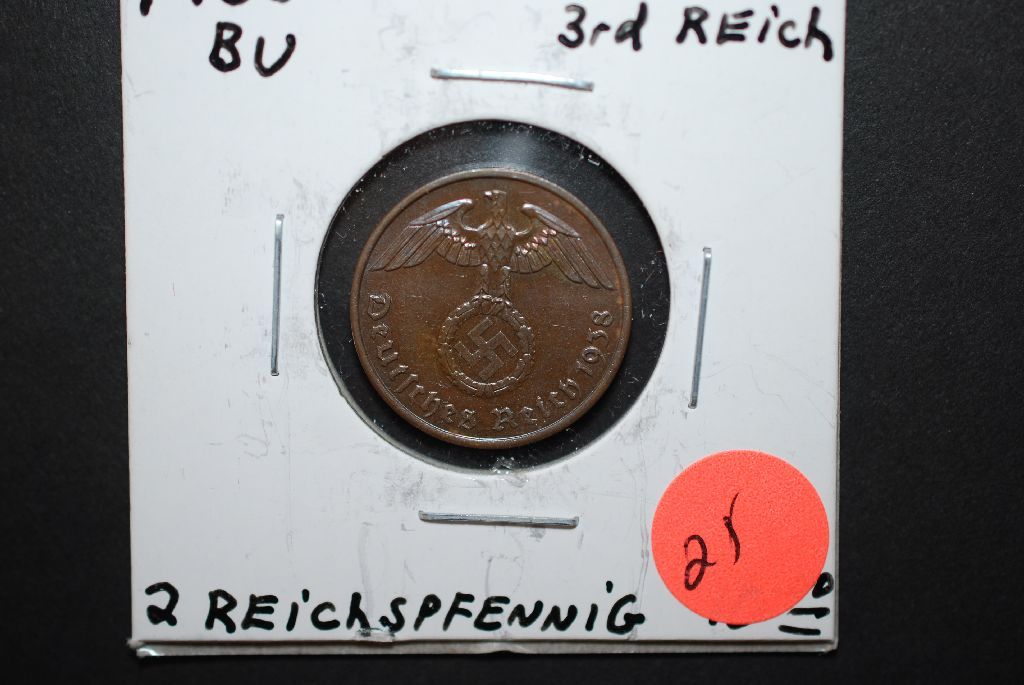 1938-A German 2 Reichspfennig Foreign Coin With Flying Eagle Holding Swatstika; BU; EST. $10-15