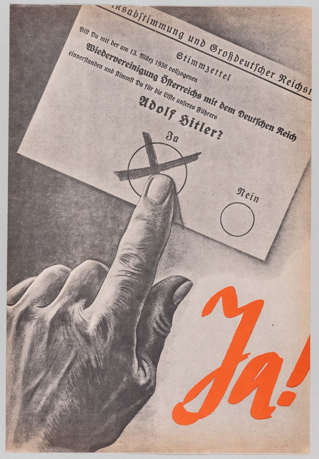 Original 1938 German propaganda poster calling on all Austrians to vote 'Yes' in support of the annexation of Austria. The poster shows the voting ballot for the plebiscite on April 10, 1938 with a finger pointing to the larger 'Yes' circle. The ballot text reads 'Do you agree with the reunification of Austria with the German Reich that was enacted on 13 March 1938, and do you vote for the party of our leader Adolf Hitler?' With a bold red 'Ja!' in the lower right. 7.5 x 11.25 inches, trimmed at margins.