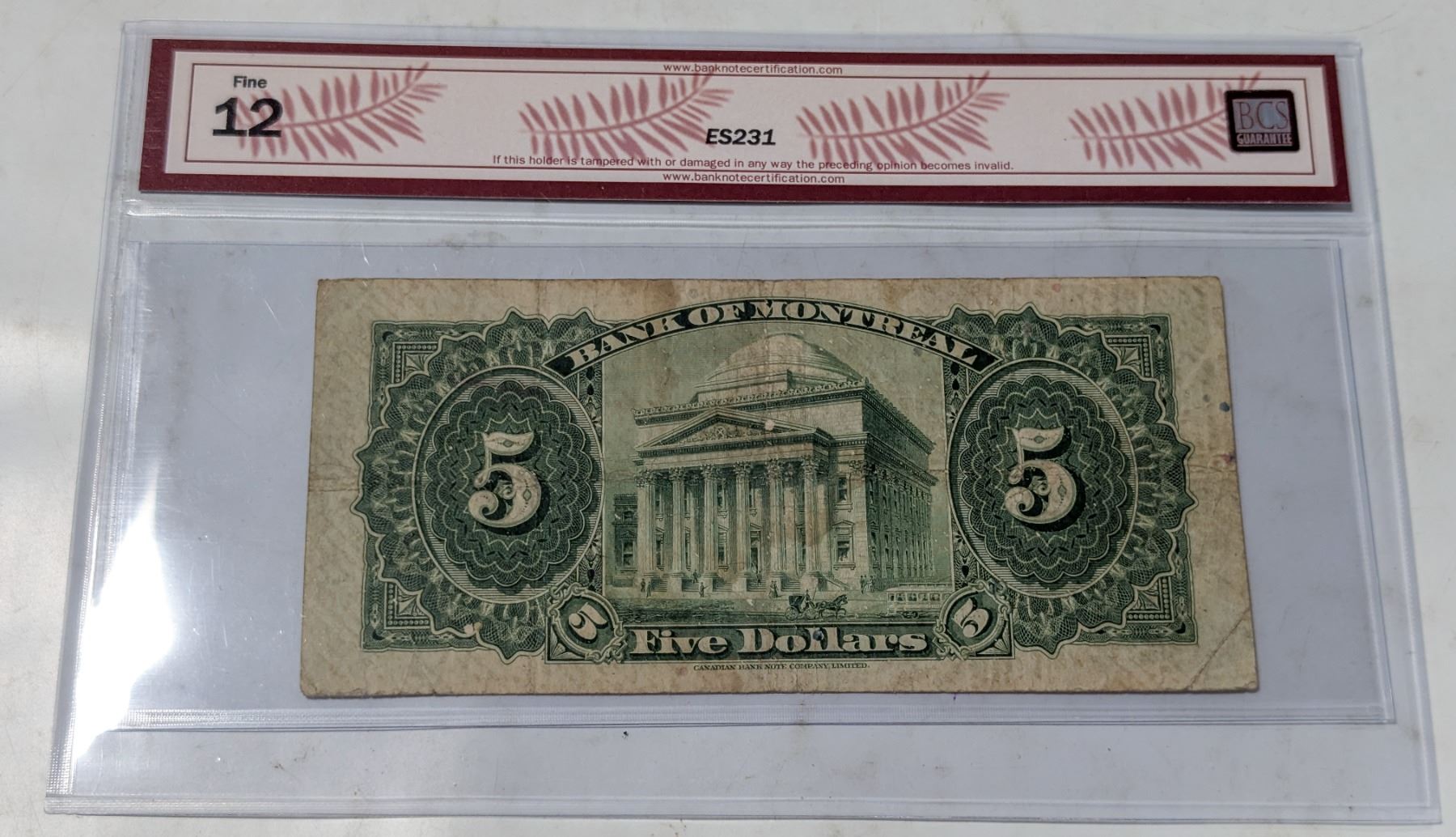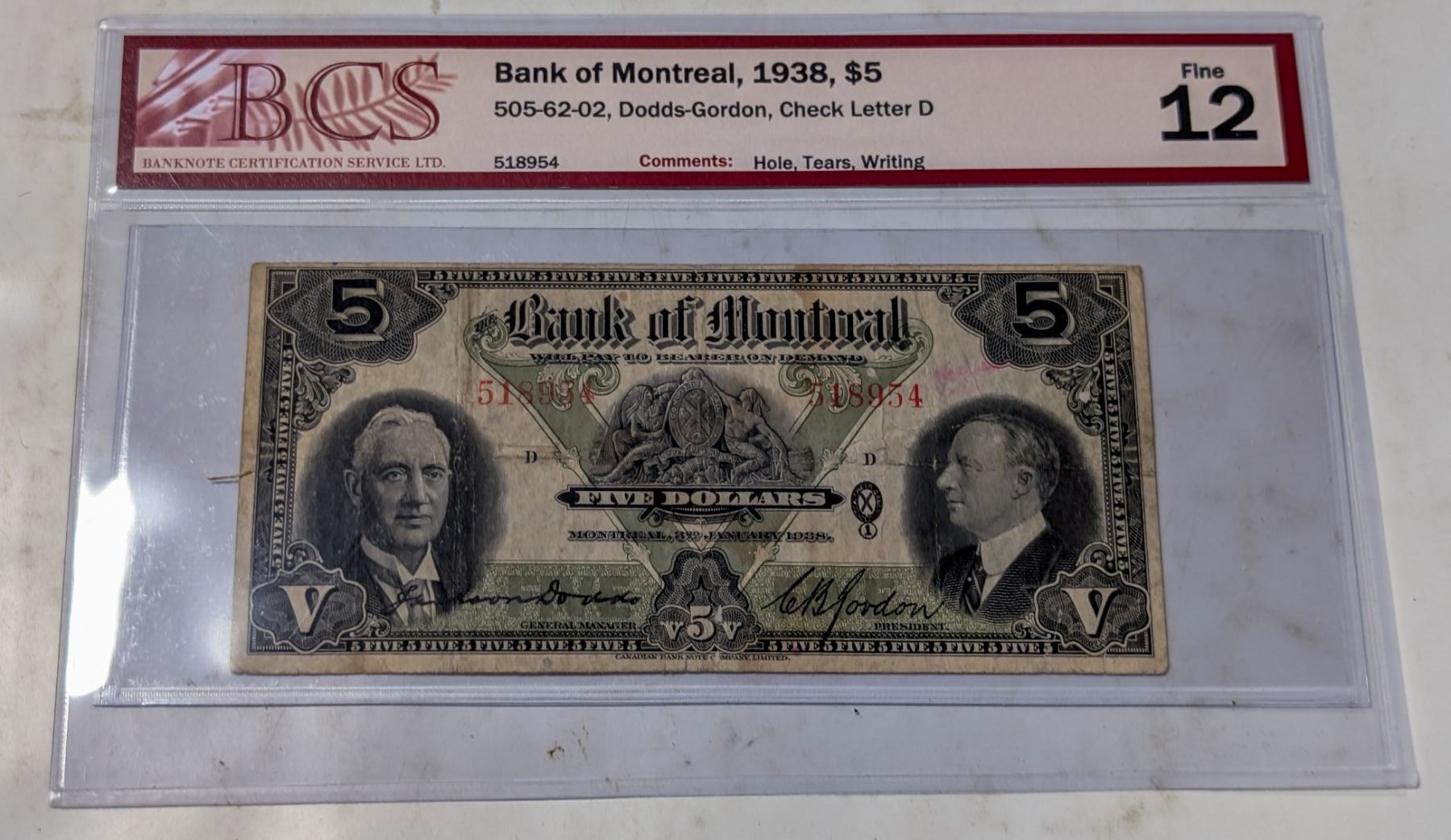 1938 BANK OF MONTREAL $5 BANKNOTE. CERTIFIED