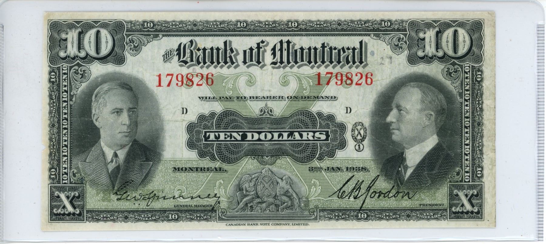 1938 Bank of Montreal $10.00 excellent condition